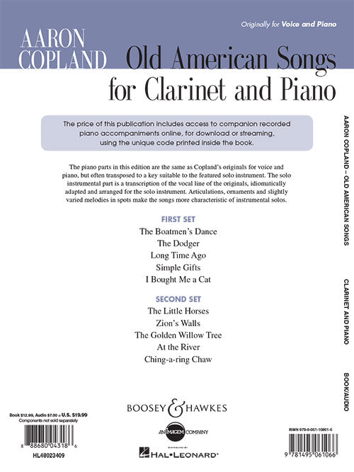Old American SongsClarinet and PianoPublisher: Boosey & HawkesCategory: Solo InstrumentalSeries: Boosey & Hawkes Chamber MusicFormat: Softcover Audio OnlineCopland's classic settings for voice and piano of 10 American folksongs have been transcribed for solo instrument and piano,...Regular price $23.99 -