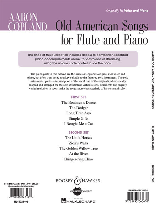 Old American SongsFlute and PianoPublisher: Boosey & HawkesCategory: Solo InstrumentalSeries: Boosey & Hawkes Chamber MusicFormat: Softcover Audio OnlineNew, idiomatic adaptations of famous Aaron Copland folksong settings, transcribed for solo instrument, and using the original piano parts....Regular price $23.99 -