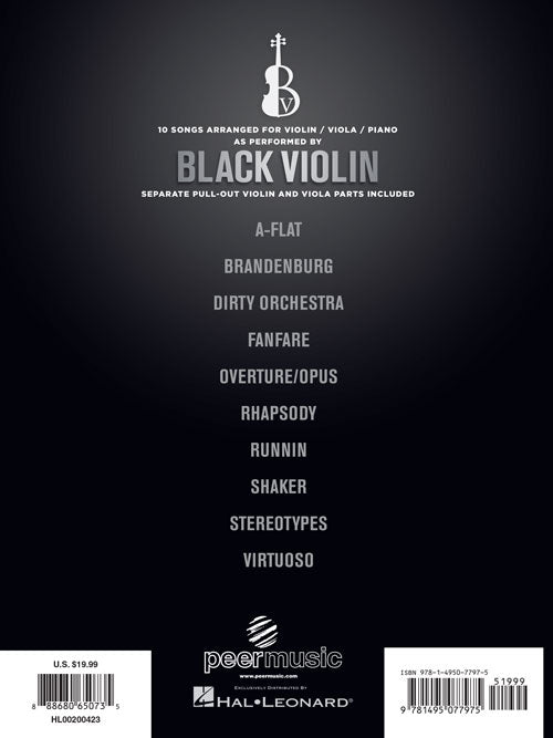 Artist: Black ViolinBlack Violin CollectionSoftcover10 original works from hip-hop, classical-crossover stars Wil B. and Kev Marcus, otherwise known as Black Violin. This collection includes pull-out parts for violin and viola in addition to the complete score....Regular price $31.99 -