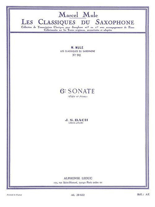 Composer: Johann Sebastian Bach6th SonataSaxophone Classics No. 92 Alto Saxophone and PianoPublisher: Alphonse LeducCategory: Solo InstrumentalSeries: LeducFormat: SoftcoverComposed by J.S. Bach originally for flute and piano, this edition of 6th Sonata was arranged for alto saxophone...Regular price $11.99
