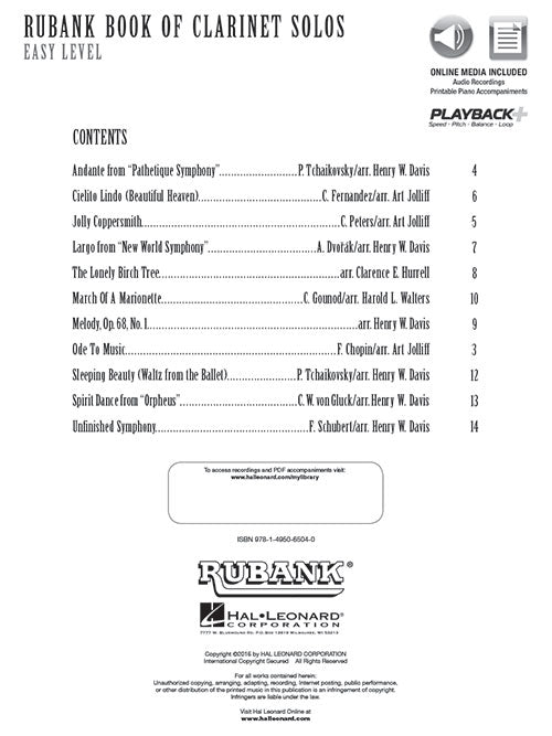 Composer: VariousRubank Book of Clarinet Solos - Easy LevelBook with Online Audio (stream or download)Softcover Media OnlineThis compilation of 11 clarinet solos from the legendary Rubank educational library now includes online access to: · Full-performance and...Regular price $17.99
