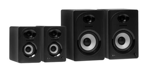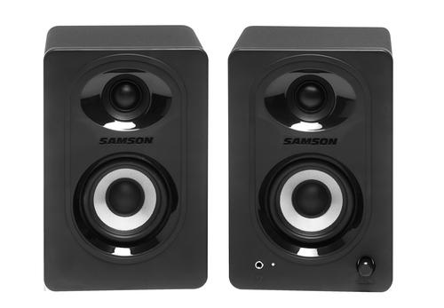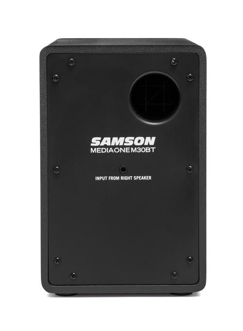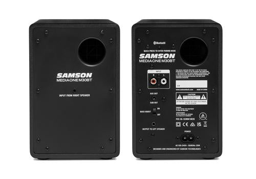 Studio Quality Sound Create the ultimate desktop listening environment with the Samson MediaOne M30BT Powered Studio Monitors. Great for home studios, streaming and gaming stations, listening to your favorite music or enhancing your home office. Available as the MediaOne M30BT with 20 watts, 3 in. woofers. Each model includes a Class AB amplifier that delivers reliable and consistent sound from top to bottom. Small Size, Big Sound MediaOne M30BT monitors incorporate an elegant, compact design that fits into any room or workspace and provides studio-quality sound for all your multimedia needs. Each model features premium woofers with butyl surrounds that provide tight lows, and 3/4 in. silk-dome tweeters housed in advanced waveguides that deliver smooth highs for a wide, balanced stereo sound stage. Making the Connections Bluetooth® connectivity allows you to wirelessy stream audio from any compatible device or app directly to the MediaOne monitors. An easy-to-reach front panel volume control sets the overall level of the speakers and headphone output. Plugging in headphones mutes the speakers for private listening sessions. An onboard Bass Boost circuit offers enhanced low-end while still delivering a clear, balanced sound. In addition, a 1/8 in. (3.5mm) full ranger stereo output allows an active subwoofer to be integrated into your M30BT speakers for true 2.1 channel performance. Highlights: · Professional multimedia speaker system · Ideal for home studios, music playback, production, gaming, and video applications · Bluetooth® connectivity to wirelessly stream music · MediaOne M30BT: 20 watts (10W per channel) · MediaOne M30BT: 3 in. woven carbon fiber woofers · 3/4 in. Silk dome tweeters for crystal clear high-end performance · Exceptional low-frequency response · Bass Boost switch · Stereo 1/8 in. Sub and headphone outputs · Sleek all-black vinyl finish · Speaker cable included