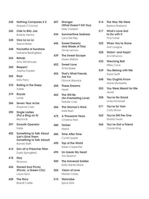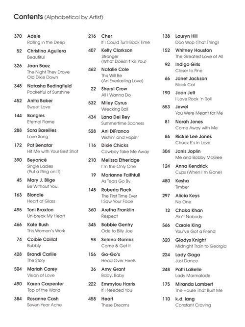 This collection features 100 songs arranged for piano, voice and guitar from 100 iconic female artists. Artists showcased include Adele, Pat Benatar, Beyoncé, Karen Carpenter, Cher, Aretha Franklin, Whitney Houston, Janis Joplin, Carole King, Lorde, Madonna, Idina Menzel, Joni Mitchell, Stevie Nicks, Dolly Parton, Diana Ross, Barbra Streisand, Taylor Swift, Tina Turner, Dionne Warwick, Amy Winehouse, and many others.