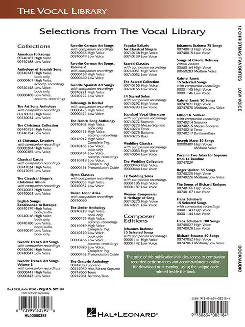 12 Christmas Favorites - Low Voice The Vocal Library Low Voice Publisher: Hal Leonard Category: Vocal Series: Vocal Collection Format: Softcover Audio Online Custom arrangements for voice and piano in two keys, High Voice and Low Voice, including Caroling, Caroling · The Christmas Song · Do You Hear What I Hear · Gesù Bambino · Go, Tell It on the Mountain · I Heard the Bells on Christmas Day · I Wonder as I Wander · I'll Be Home for Christmas · O Holy Night · Silver Bells · Some Children See Him · White Christmas. Book includes access to online audio files. Online audio is accessed at halleonard/mylibrary (halleonard/mylibrary/) . Seasonal: Christmas Inventory # : 00000385 UPC: 73999335958 ISBN: 634082183 Width: 9" Length: 12" Height: 0.141" Product Weight: 0.5 lbs. Number of Pages: 56