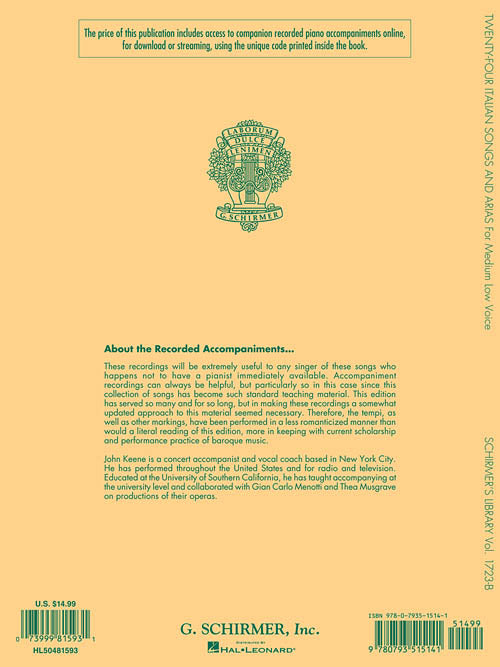 This collection of carefully prepared recorded piano accompaniments (John Keene, pianist) will become a valuable tool for any student of singing. The book has long been a standard in teaching literature and is very likely to be the first publication a voice teacher would ask a beginning student to buy. John Keene is a concert accompanist and vocal coach based in New York City. He has performed throughout the United States and for radio and television. Educated at the University of Southern California, he has taught accompanying at the university level and collaborated with Gian Carlo Menotti and Thea Musgrave on productions of their operas. Contents: Alma Del Core · Amarilli, Mia Bella · Caro mio ben · Che Fiero Costume · Comme Raggio di Sol · Danza, Danza, Fanciulla Gentile · Gia Il Sole Dal Gange · Il Mio Bel Foco · Lasciatemi Morire · Le Violette · Nel Cor Piu Non Sento · Nina · Non Posso Disperar · O Cessate Di Piagarmi · O Del Mio Dolce Ardor · Per La Gloria D'Adorarvi · Pieta, Signore · Pur Dicesti, O Bocca Bella · Se Florindo E Fedele · Se Tu M'ami, Se Sospiri · Sebben, Crudele · Tu Lo Sai · Vergin, Tutto Amor · Vittoria, Mio Core.
