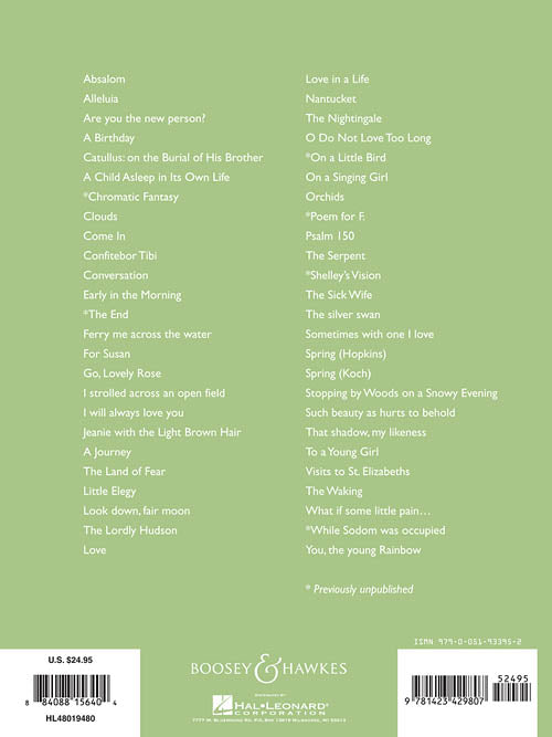 One of the most prolific and respected of American art song composers, Ned Rorem is finally represented in a substantial, representative collection, which includes six songs never before published (in boldface in the contents list), and many newly published transpositions. Contents: Absalom · Alleluia · Are you the new person? · A Birthday · Catullus: on the Burial of His Brother · A Child Asleep in Its Own Life · Chromatic Fantasy · Clouds · Come In (High Voice only) · Confitebor Tibi (High Voice only) · Conversation · Early in the Morning · The End · Ferry me across the water · For Susan · A Glimspe (Low Voice only) · Go, Lovely Rose (High Voice only) · He Thinks Upon His Death (Low Voice only) · I strolled across an open field · I will always love you · Jeanie with the Light Brown Hair · A Journey · The Land of Fear · Little Elegy · Look down, fair moon · The Lordly Hudson · Love · Love in a Life · Nantucket · The Nightingale · O Do Not Love Too Long · On a Little Bird · On a Singing Girl · Orchids · Philomel (Low Voice only) · Poem for F. · Psalm 150 · Rain in Spring (Low Voice only) · The Serpent · Shelley's Vision · The Sick Wife · The silver swan (High Voice only) · Sometimes with one I love · Spring (Manley Hopkins) · Spring (Koch) · Stopping by Woods on a Snowy Evening · Such beauty as hurts to behold · That shadow, my likeness · To a Young Girl · Visits to St. Elizabeths · The Waking · What if some little pain... · While Sodom was occupied · You, the young rainbow.