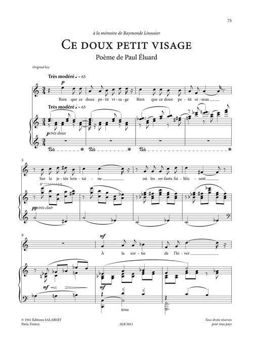 Poulenc compiled a catalogue of 150 songs, a body of work of consistently high quality, containing great diversity, that marks him out as the last major exponent of this genre of music. This volume is part of Musique vocale française, a series devoted to French vocal repertoire - both in original and transposed key - designed for students and teachers as well as professionals. This lovely volume features new engravings, original poems, and English translations. Contents include: Toréador (Chanson hispano-italienne) · Le Bestiaire (ou Cortège d'Orphée): Le Dromadaire, La Chèvre du Thibet, La Sauterelle, Le Dauphin, L'Ecrevisse, La Carpe · Airs chantés: Air romantique, Air champêtre, Air grave, Air vif · Quatre Poèmes de Guillaume Apollinaire: L'Anguille, Carte postale, Avant le cinema, 1904 · Tel jour telle nuit: Bonne journée, Une ruine coquille vide, Le Front comme un drapeau perdu, Une roulotte couverte en tuiles, À toutes brides, Une herbe pauvre, Je n'ai envie que de t'aimer, Figure de force brûlante et farouche, Nous avons fait la nuit · Ce doux petit visage · Fiançailles pour rire: La Dame d'André, Dans l'herbe, Il vole, Mon cadavre est doux comme un gant, Violon, Fleurs · Bleuet · Les Chemins de l'amour (Valse chantée extraite de Léocadia) · Banalités: Chanson d'Orkenise, Hôtel, Fagnes de Wallonie, Voyage à Paris, Sanglots · Métamorphoses: Reine de mouettes,C'est ainsi que tu es, Paganini · Deux Poèmes de Louis Aragon: C., Fêtes galantes · La Courte Paille: Le Sommeil, Quelle aventure!, La Reine de coeur, Ba, Be, Bi, Bo, Bu, Les Anges musiciens, Le Carafon, Lune d'avril.