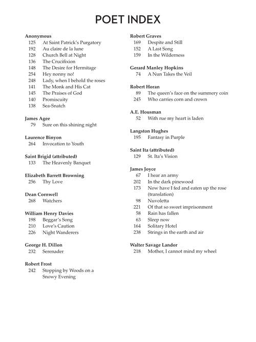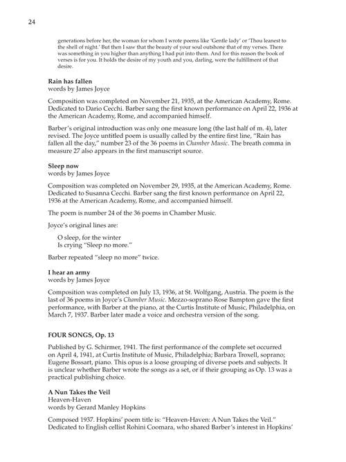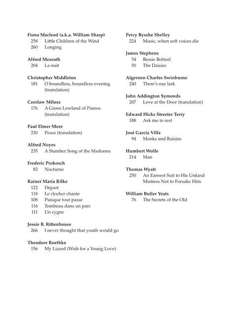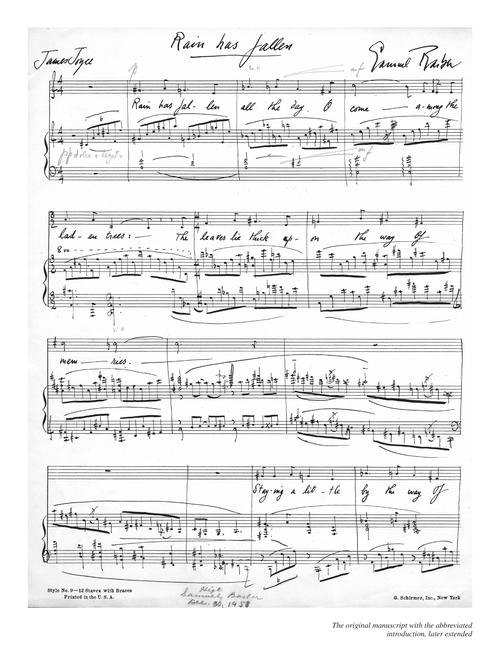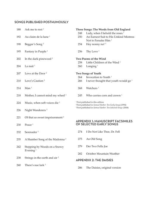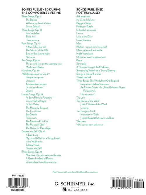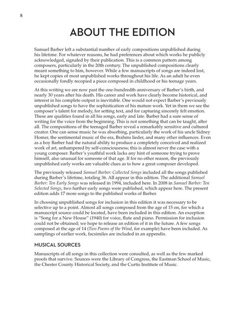 In celebration of the 100th anniversary of the birth of Samuel Barber, we are proud to release this major new edition, which includes newly edited and engraved editions of the complete contents of Collected Songs and Ten Early Songs (1994), plus many previously unpublished early songs. Manuscripts from the Library of Congress and other sources were consulted for all songs. The edition includes extensive historical information about each song, a lengthy and insightful article about Barber, and facsimiles of selected manuscripts. Songs published during the composer's lifetime (In chronological order of publication) Three Songs, Op. 2: The Daisies; With rue my heart is laden; Bessie Bobtail · Three Songs, Op. 10: Rain has fallen; Sleep now; I hear an army · Four Songs, Op. 13: A Nun Takes the Veil; The Secrets of the Old; Sure on this shining night; Nocturne · Two Songs, Op. 18: The queen's face on the summery coin; Monks and Raisins · Nuvoletta, Op. 25 o Mélodies passagères, Op. 27: Puisque tout passé; Un cygne; Tombeau dans un parc; Le clocher chante; Départ · Hermit Songs, Op. 29: At Saint Patrick's Purgatory; Church Bell at Night; St. Ita's Vision; The Heavenly Banquet; The Crucifixion; Sea-Snatch; Promiscuity; The Monk and His Cat; The Praises of God; The Desire for Hermitage · Despite and Still, Op. 41: A Last Song; My Lizard (Wish for Young Love); In the Wilderness; Solitary Hotel; Despite and Still · Three Songs, Op. 45: Now have I fed and eaten up the rose; A Green Lowland of Pianos; O boundless, boundless evening Songs published posthumously 1 First published in this edition 2 First published in Samuel Barber: Ten Early Songs (1994) 3 First published in Samuel Barber: Ten Selected Songs (2008) Ask me to rest 1 · Au claire de lune 1 · Beggar's Song 2 · Fantasy in Purple 1 · In the dark pinewood 2 · La nuit 1 · Love at the Door 2 · Love's Caution 2 · Man 1 · Mother, I cannot mind my wheel 3 · Music, when soft voices die 1 · Night Wanderers 2 · Of that so sweet imprisonment 2 · Peace 1 · Serenader 2 · A Slumber Song of the Madonna 2 · Stopping by Woods on a Snowy Evening 1 · Strings in the earth and air 2 · There's nae lark 2 · Three Songs, The Words from Old England: Lady, when I behold the roses 1; An Earnest Visit to His Unkind Mistress Not to Forsake Him 1; Hey nonny no! 3 · Two Poems of the Wind: Little Children of the Wind 1; Longing 1 · Two Songs of Youth: I never thought that youth would go 1; Invocation to Youth · Watchers 1 · Who carries corn and crown 1
