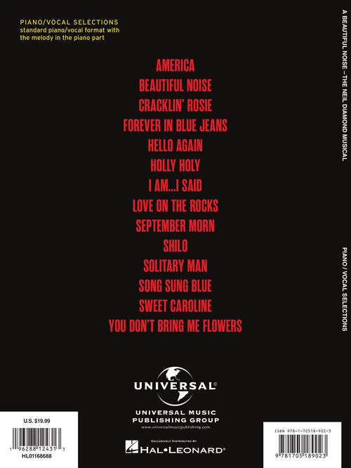 The story of the legendary Neil Diamond comes to life on stage in an uplifting new musical featuring all his hit songs, including: America · Cracklin' Rosie · Forever in Blue Jeans · Solitary Man · Song Sung Blue · Sweet Caroline · You Don't Bring Me Flowers · and more. Our folio features 14 songs from the show arranged in standard piano/vocal format with the melody in the piano part.