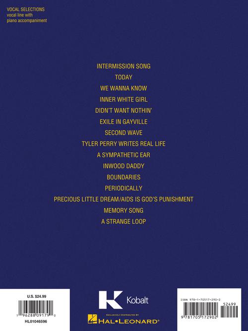 Winner of the Tony Award® for Best Musical, Michael R. Jackson's Pulitzer Prize-winning blisteringly funny masterwork exposes the heart and soul of a young artist grappling with desires, identity, and instincts he both loves and loathes. This collection features 15 songs from the show arranged for vocal line with piano accompaniment. Songs include: Boundaries · Didn't Want Nothin' · Exile in Gayville · Inner White Girl · Intermission Song · Inwood Daddy · Memory Song · Periodically · Precious Little Dream / AIDS Is God's Punishment · Second Wave · A Strange Loop · A Sympathetic Ear · Today · Tyler Perry Writes Real Life · We Wanna Know.