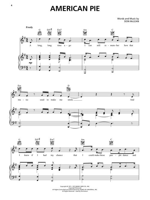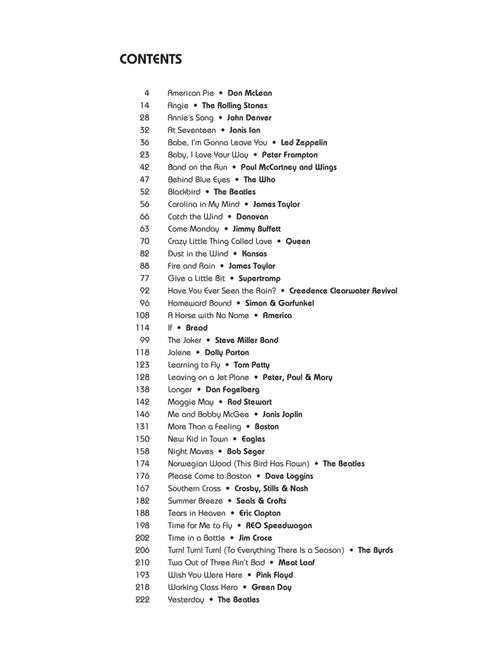 This updated edition features 42 acoustic favorites for piano, voice and guitar, including: American Pie · At Seventeen · Babe, I'm Gonna Leave You · Come Monday · Dust in the Wind · Fire and Rain · Give a Little Bit · A Horse with No Name · If · Jolene · Leaving on a Jet Plane · Maggie May · Night Moves · Summer Breeze · Tears in Heaven · Time in a Bottle · Wish You Were Here · Yesterday · and more.