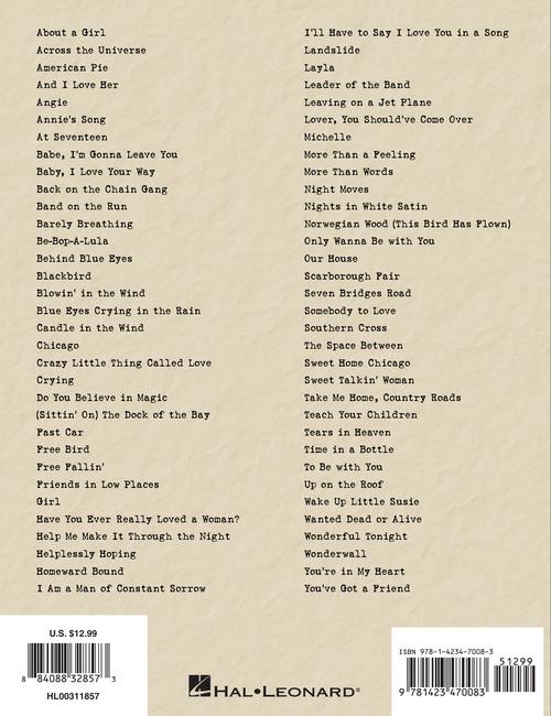 Get lots of bang for your acoustic buck with this collection of 66 unplugged jewels: American Pie · Baby, I Love Your Way · Blackbird · Fast Car · Free Bird · Leaving on a Jet Plane · More Than Words · Scarborough Fair · Tears in Heaven · Time in a Bottle · Wonderwall · more.