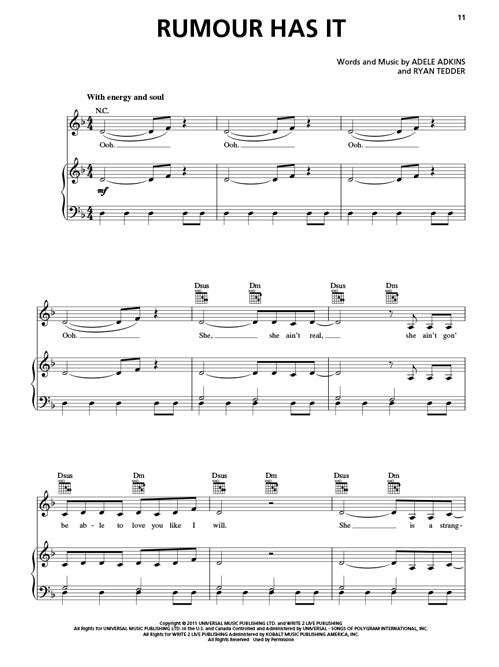 Adele's sophomore CD 21 has enjoyed enormous critical acclaim, with reviewers lauding this British, multi-Grammy-winner's vocal performance and introspective songwriting. The Hal Leonard songbook matches the CD, with piano/vocal/guitar arrangements of the smash hits Rolling in the Deep and Someone like You, plus: Don't You Remember · He Won't Go · I'll Be Waiting · Lovesong · One and Only · Rumour Has It · Set Fire to the Rain · Take It All · Turning Tables.