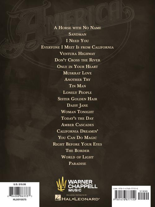Three young kids took the world by storm in the early 1970s, rocking their way to many top hits that remain radio staples. Our collection features 22 all-time favorites from America: Daisy Jane · Don't Cross the River · A Horse with No Name · I Need You · Lonely People · Muskrat Love · Sister Golden Hair · Tin Man · Ventura Highway · You Can Do Magic · and more.