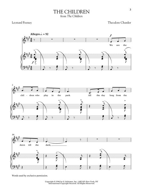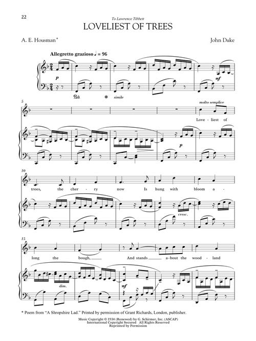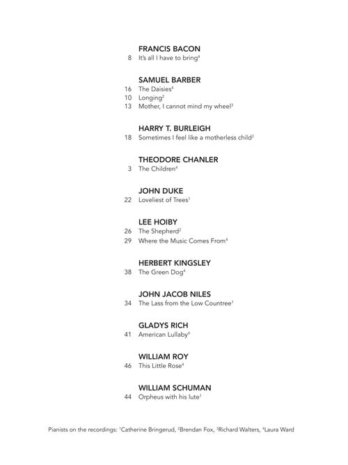 The vocal and musical abilities of high school and college singers have guided the song choices in this series. These volumes introduce classical voice students to American art song, with some of the most often studied music in the genre. The Soprano and Mezzo-Soprano/Alto volumes have the same song list, but in different keys. The same is true of the Tenor and Baritone/Bass song lists. ERNST BACON: It's all I have to bring · SAMUEL BARBER: The Daisies · SAMUEL BARBER: Longing · SAMUEL BARBER: Mother, I cannot mind my wheel · HARRY T. BURLEIGH: Sometimes I feel like a motherless child · THEODORE CHANLER: The Children · JOHN DUKE: Loveliest of Trees · LEE HOIBY: The Shepherd · LEE HOIBY: Where the Music Comes From · HERBERT KINGSLEY: The Green Dog · JOHN JACOB NILES: The Lass from the Low Countree · GLADYS RICH: American Lullaby · WILLIAM ROY: This Little Rose · WILLIAM SCHUMAN: Orpheus with his lute