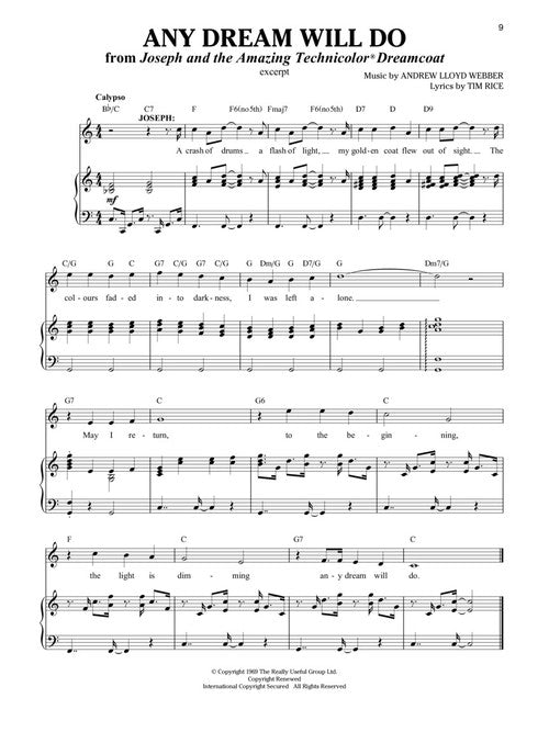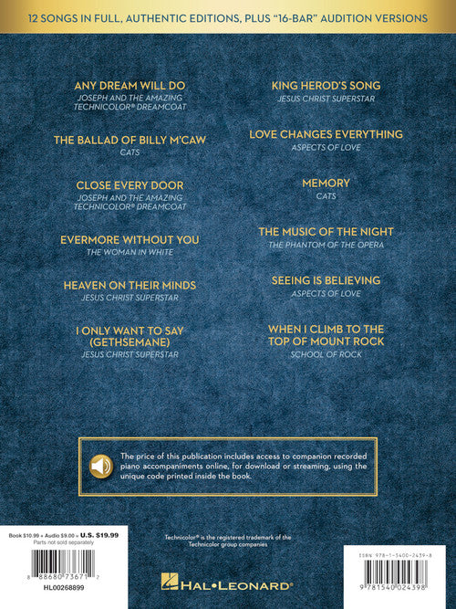A dozen of Andrew Lloyd Webber's most memorable musical theatre compositions for men's voices. The book includes full versions and 16-bar audition cuts for each song, and recorded accompaniments for each version available online for download or streaming. Songs: Any Dream Will Do · The Ballad of Billy M'Caw · Close Every Door · Evermore Without You · Heaven on Their Minds · I Only Want to Say (Gethsemane) · King Herod's Song · Love Changes Everything · Memory · The Music of the Night · Seeing Is Believing · When I Climb to the Top of Mount Rock.