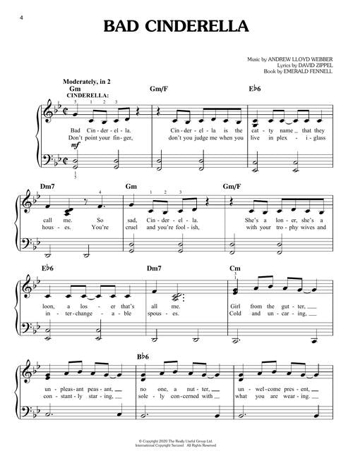 Andrew Lloyd Webber's musical adaptation of the classic Cinderella fairy tale premiered in London's West End in 2021. This songbook features easy piano arrangements for 14 songs from the production: Bad Cinderella · Beauty Has a Price · The Cinderella Waltz · Far Too Late · I Am No Longer Me · I Know I Have a Heart · I Know You · Man's Man · Moment of Triumph · Only You, Lonely You · So Long · Unbreakable · The Vanquishing of the Three-Headed Sea Witch · The Wedding March.