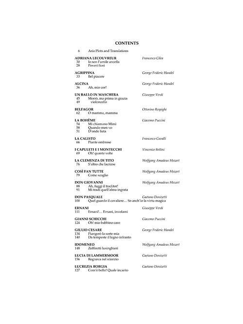 Comprehensive collections of arias in Italian, with translations and plot notes. Includes some arias not found in any other collections. Contents: ADRIANA LECOUVREUR: Io son l'umile ancella, Poveri fiori · AGRIPPINA: Bel piacere · ALCINA: Ah mio cor! · UN BALLO IN MASCHERA: Morro, ma prima in grazia · BELFAGOR: O mamma, mamma · LA BOHEME: Mi chiamano Mimi, Quando men vo, D;onde lieta · LA CALISTO: Piante ombrose · I CAPULETI E I MONTECCHI: Oh! quante volte · LA CLEMENZA DI TITO: S'altro che lacrime · COSI FAN TUTTE: Come scoglio · DON GIOVANNI: Ah, fuggi il traditor!, Mi tradi quell'alma ingrata · DON PASQUALE: Quel guardo il cavaliere... So anch'io la virtu magica · ERNANI: Ernani!... Ernani, involami · GIANNI SCHICCHI: Oh! mio babbino caro · GIULIO CESARE: Piangero la sorte mia, Da tempeste il legno infranto · IDOMENEO: Zeffiretti lusinghieri · LUCIA DI LAMMERMOOR: Regnava nel silenzio · LUCREZIA BORGIA: Com'e bello! Quale incanto · MADAMA BUTTERFLY: un bel di, vedremo · IL MARITO DISPERATO: Dovrei punirti · MEFISTOFELE: L'altra notte in fondo al mare · LE NOZZE DI FIGARO: Dove sono i bei momenti · PAGLIACCI: Stridono lassu · IL RE PASTORE: L'amero, saro costante · LA SERVA PADRONA: Stizzoso, mio stizzoso · LA SONNAMBULA: Ah! non credea mirarti... Ah! non giunge · sour angelica: Senza mamma · IL TIGRANE: Squarciami pure il seno · IL TITO: Che mi consigli, Amor? · TOSCA: vissi d'arte, vissi d'amore · LA TRAVIATA: Ah, forse e lui... Sempre libera · IL TROVATORE: Tacea la notte placida, D'amor sull'ali rosee · TURANDOT: Tanto amore, segreto · LE VILLI: Se come voi piccina · LA WALLY: Ebben?... Ne andro lontana