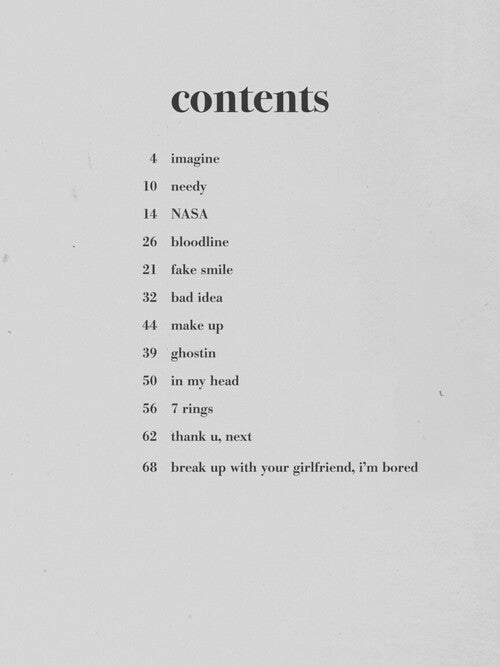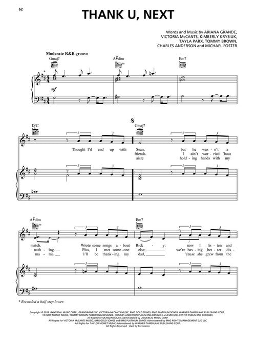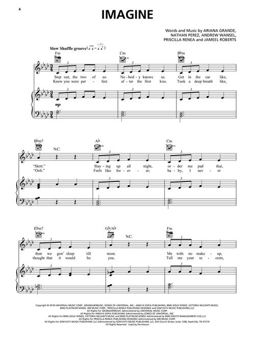 This 2019 album, released on the heels of Grande's popular 2018 release, Sweetener, topped the Billboard® 200 album charts. Our piano/vocal/guitar songbook features the hit title track, the followup blockbuster 7 Rings plus 10 more: Bad Idea · Bloodline · Break up with Your Girlfriend, I'm Bored · Fake Smile · Ghostin · Imagine · In My Head · Make Up · NASA · Needy.