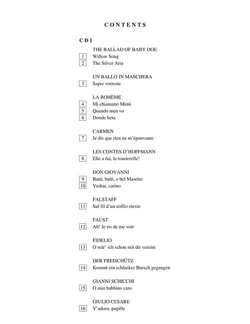 The companion accompaniment recordings to the best-selling series in the G. Schirmer Opera Anthology. Each aria is recorded by a professional coach/accompanist working in the opera world. Contents: Ach, Ich Fuhl's (The Magic Flute) · Adieu, Notre Petite Table (Massenet) · Ah Je Rise De Me Voir · Ah Je Veux Vivre · Batti, Batti, O Bel Masetto · Bester Jungling · The Black Swan · Caro Nome · Deh Vieni, Non Tardar (The Marriage Of Figaro) · Donde Lieta Usci · Dove Sono I Bei Momenti · Elle A Fui, La Tourterelle · Fair Robin I Love · Je Dis Que Rien Ne M'epouvante · Kommt Ein Schlanker Bursch Geg- · Mi Chiamano Mimi · Monica's Waltz · O Mio Babbino Caro · O War' Ich Schon Mit Dir Vereint · Porgi, amor from Le Nozze di Figaro · Quando Men Vo · Saper Vorreste (Verdi) · Signore Ascolta · The Silver Aria · Stridono Lassu · Sul Fil D'un Soffio (Verdi) · Tu Che Di Gel Sei Cinta · Un Bel Di Vedremo · V'adoro, Pupille · Vedrai, Carino · Willow Song