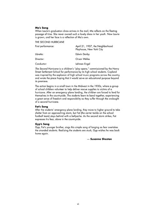 This collection of 24 songs and arias draws on works that span the composer's lifetime, including his early experimental and mature Americana periods. Contents include: Four Early Songs, Twelve Poems of Emily Dickinson, arias from The Tender Land and The Second Hurricane, and more. Contents: SONGS: Dirge in Woods · Old Poem · Pastorale · Poet's Song · Vocalise · Four Early Songs: (NIght · A Summer Vacation · My Heart Is in the East · Alone) · Twelve Poems of Emily Dickinson: (1. Nature, the Gentlest Mother · 2. There Came a Wind like a Bugle · 3. Why Do They Shut me out of Heaven? · 4. The World Feels Dusty · 5. Heart, We Will Forget Him · Dear March, Come in! · 7. Sleep Is Supposed to Be · 8. When They Come Back · 9. I Felt a Funeral in my Brain · 10. I've Heard an Organ Talk Sometimes · 11. Going to Heaven! · 12. The Chariot) · ARIAS: from The Tender Land: Ma's Song · from The Second Hurricane: Fat's Song · Gyp's Song
