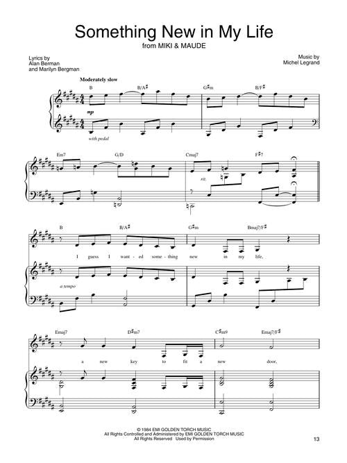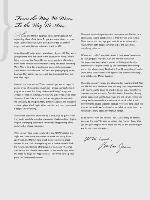Ten songs from Barbra's Grammy-nominated tribute album to her close friends, songwriters Alan and Marilyn Bergman. Contains: Alone in the World · I'll Never Say Goodbye · Nice 'n' Easy · The Same Hello, The Same Goodbye · So Many Stars · Solitary Moon · Something New in My Life · That Face · What Matters Most · The Windmills of Your Mind. Includes moving prefaces written by both Barbra and the Bergmans.