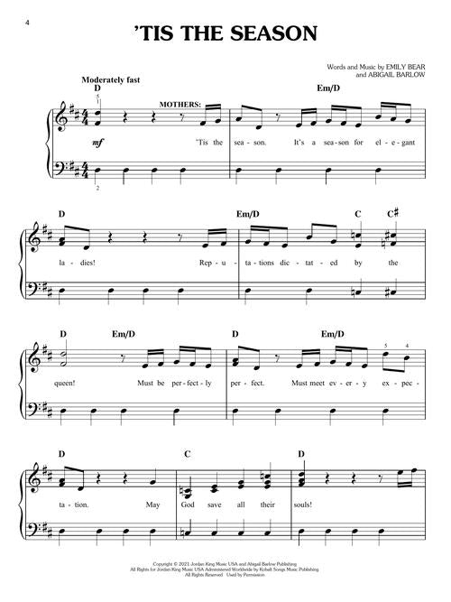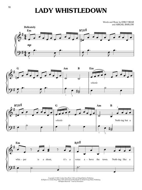 Inspired by the popular Netflix series, Abigail Barlow and Emily Bear asked, What if Bridgerton was a musical? They composed 15 original songs in 6 weeks, live in real time on social media, attracting a massive international fanbase, with over two million followers and over 36 million likes on TikTok alone! The full album was released in September 2021 and soared to #1 on iTunes within 1.5 hours of its release. Barlow & Bear are performing at concerts and music events around the world and were just nominated for a Grammy® for their work! Our folio features 12 tracks arranged for easy piano with lyrics. The arrangements were carefully approved by Emily Bear herself, ensuring they are true to the spirit of what she played on the original recording. The book also includes photos and an introduction on the story of the musical's creation. Songs include: Alone Together · Balancing the Scales · Burn for You · Entertain Me · Every Inch · Fool for You · Friend Turned Foe · If I Were a Man · Lady Whistledown · Ocean Away · Penelope Featherington · Tis the Season.