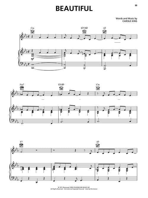 Beautiful tells of the story of one of the 20th century's most beloved songwriters, Carole King, through 25 of the hit songs she penned for herself and others. Piano/vocal arrangements include: Beautiful · I Feel the Earth Move · It's Too Late · The Loco-Motion · (You Make Me Feel Like) a Natural Woman · One Fine Day · So Far Away · Some Kind of Wonderful · Up on the Roof · Will You Love Me Tomorrow (Will You Still Love Me Tomorrow) · You've Got a Friend · You've Lost That Lovin' Feelin' · and more.