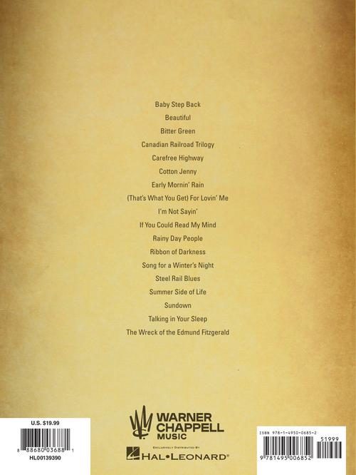 18 of the best-loved songs from this legendary folk rock singer/songwriter are presented for piano, voice and guitar: Carefree Highway · Early Mornin' Rain · If You Could Read My Mind · Rainy Day People · Sundown · Talking in Your Sleep · The Wreck of the Edmund Fitzgerald · and more.