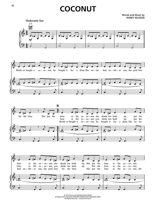 15 songs from this Grammy Award-winning singer/songwriter whose songs were made popular in the '70s. Our collection includes 15 songs in arrangements for piano, voice and guitar: Coconut · Everybody's Talkin' (Echoes) · Jump into the Fire · Me and My Arrow · One · Spaceman · Without You · You're Breakin' My Heart · and more.