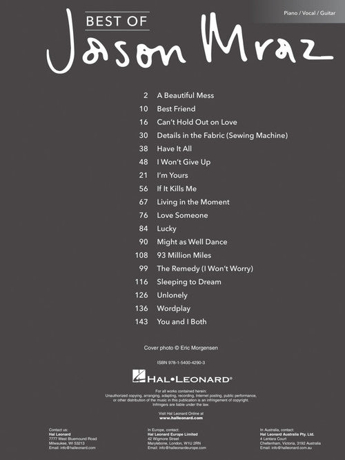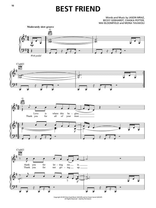 18 favorites from this contemporary pop star arranged for piano, voice, and guitar. Includes: A Beautiful Mess · Details in the Fabric (Sewing Machine) · I Won't Give Up · I'm Yours · Lucky · The Remedy (I Won't Worry) · Sleeping to Dream · You and I Both · and more!