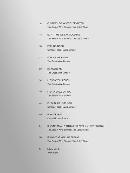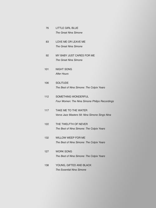 One of the most powerful live performers of her time, Nina Simone mixed jazz, blues, soul, classical and more to create a genre all her own. This book features authentic transcriptions in the original keys of 23 Simone classics in voice with piano accompaniment format: Feeling Good · He Needs Me · I Loves You Porgy · I Put a Spell on You · It Don't Mean a Thing (If It Ain't Got That Swing) · It Might As Well Be Spring · Little Girl Blue · My Baby Just Cares for Me · Solitude · Willow Weep for Me · Work Song · Young, Gifted and Black · and more.
