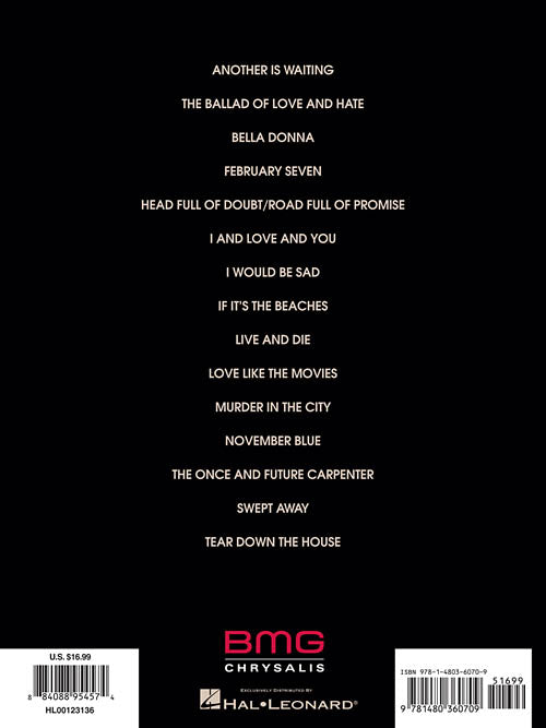 15 songs from the alt-country/folk- and roots-influenced group out of North Carolina, including: Another Is Waiting · The Ballad of Love and Hate · Bella Donna · February Seven · Head Full of Doubt/Road Full of Promise · I and Love and You · I Would Be Sad · If It's the Beaches · Live and Die · Love like the Movies · Murder in the City · November Blue · The Once and Future Carpenter · Swept Away · Tear Down the House.