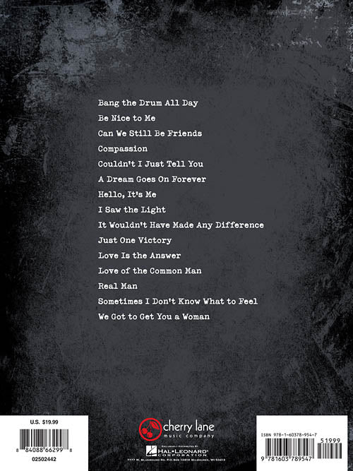 15 songs from this musical pioneer's long career, including: Bang the Drum All Day · Be Nice to Me · Can We Still Be Friends · Compassion · Couldn't I Just Tell You · A Dream Goes On Forever · Hello, It's Me · I Saw the Light · It Wouldn't Have Made Any Difference · Just One Victory · Love Is the Answer · Love of the Common Man · Real Man · Sometimes I Don't Know What to Feel · We Got to Get You a Woman. Includes a bio and a timeline of his many groundbreaking endeavors.