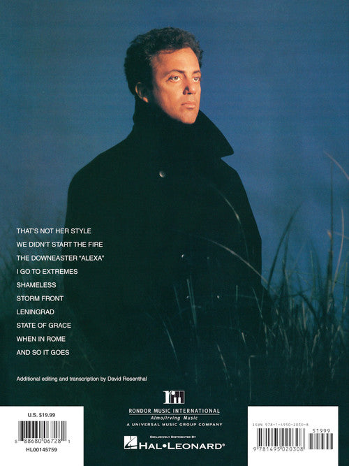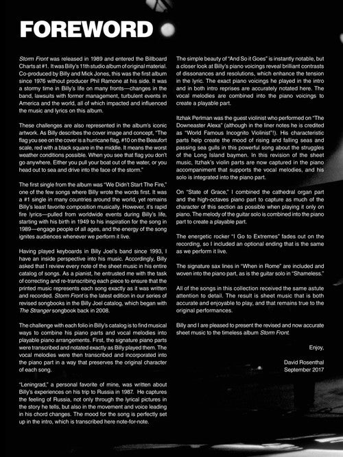 Billy Joel's keyboardist and Music Director David Rosenthal has attentively arranged all the tracks from Joel's 1989 album to combine the piano parts and vocal melodies into playable arrangements with accurate transcriptions of those classic piano parts that are integral to each song. The huge hit We Didn't Start the Fire is included along with 9 other classics: And So It Goes · The Downeaster Alexa · I Go to Extremes · Leningrad · Shameless · State of Grace · Storm Front · That's Not Her Style · When in Rome. Includes a foreword by David Rosenthal as well as great photos of Billy throughout and copies of his handwritten lyrics.