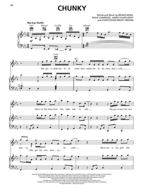 This third studio album by the ever popular Bruno Mars reached #2 on the Billboard® 200 charts, and features the title track plus eight more songs arranged for piano, voice and guitar: Calling All My Lovelies · Chunky · Finesse · Perm · Straight Up & Down · That's What I Like · Too Good to Say Goodbye · Versace on the Floor.