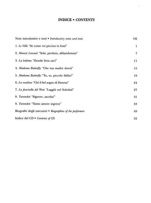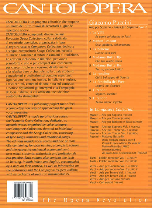 Includes a CD with a full performance with orchestra, as well as a fully-orchestrated accompaniment track. Contains the lyrics of the arias, plus a short plot summary and background information on the orchestra and the performers. Includes pieces from Le Villi, Manon Lescaut, La bohème, Madama Butterfly, La rondine, La fanciulla del West, and Turandot.