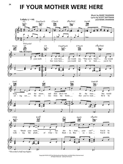 11 songs penned by Marc Shaiman for the London theatrical release of the musical adaptation of Roald Dahl's children's novel of the same name. This collection includes piano/vocal arrangements with the melody in the piano part. Songs: Almost Nearly Perfect · Don'cha Pinch Me Charlie · If Your Mother Were Here · It Must Be Believed to Be Seen · A Letter from Charlie Bucket · A Little Me · More of Him to Love · Pure Imagination · Simply Second Nature · Strike That, Reverse It · When Veruca Says.