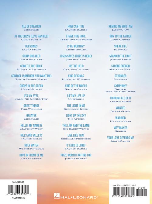 Show your praise of God through this collection of 40 Christian favorites from the 2010s! It features 40 arrangements for piano, voice and guitar, including: Blessings (Laura Story) · Chain Breaker (Zach Williams) · Come to the Table (Sidewalk Prophets) · Greater (MercyMe) · Hills and Valleys (Tauren Wells) · Hope in Front of Me (Danny Gokey) · Lift My Life Up (Unspoken) · The Lion and the Lamb (Big Daddy Weave) · O' Lord (Lauren Daigle) · and more.