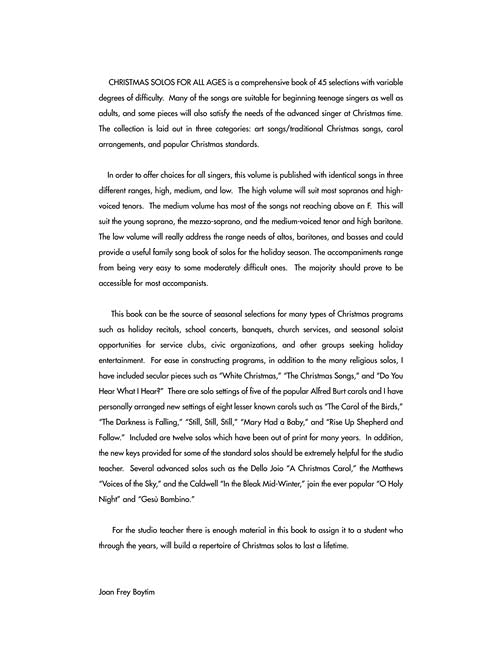 The most practical, all-around Christmas collection for singers, with 45 essential solos for the season. There are traditional carol arrangements, art songs and traditional Christmas songs, and three of the greatest of all popular Christmas standards. All songs are in English. Available in three keys, this collection is perfect literature for teaching voice. Songs include: As Lately We Watched · The Birthday of a King · Carol of the Birds · The Christmas Song (Chestnuts Roasting on an Open Fire) · Do You Hear What I Hear · Fum, Fum, Fum · Lo, How a Rose E'er Blooming · Mary Had a Baby · O Holy Night · Some Children See Him · White Christmas · and more.