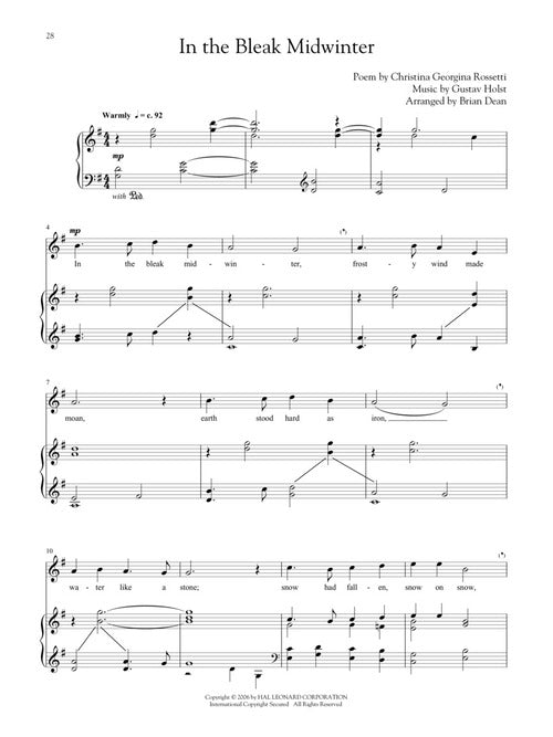 15 holiday classics in beautiful classical arrangements for high voice, with accompaniment tracks available online for download or streaming. Includes: The Christmas Song (Chestnuts Roasting on an Open Fire) · Christmas Time Is Here · The Christmas Waltz · Have Yourself a Merry Little Christmas · I Wonder As I Wander · I'll Be Home for Christmas · In the Bleak Midwinter · It Came Upon the Midnight Clear · Mary Had a Baby · The Most Wonderful Time of the Year · O Holy Night · Silent Night · Silver Bells · Sleigh Ride · White Christmas.