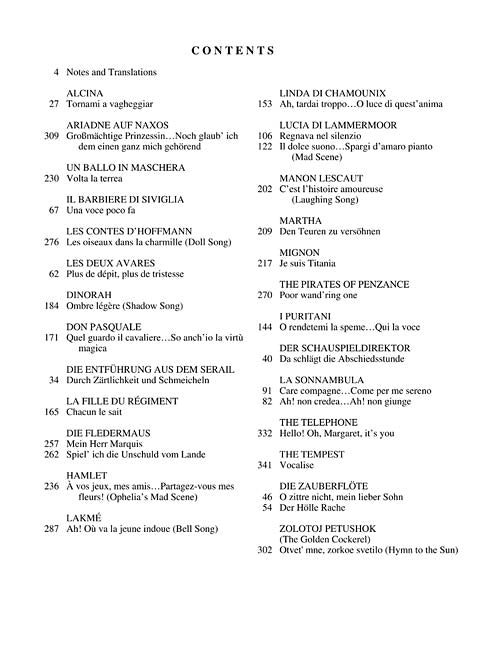 An excellent volume of coloratura arias has been added to the G. Schirmer Opera Anthology series. With 30 arias in English, Italian, German, French and Russian, this is the largest collection of coloratura operatic excerpts ever published. Contents: ALCINA: Tornami a vagheggiar · ARIADNE AUF NAXOS: Grossmachtige Prinzessin... Noch glaub' ich dem einen ganz mich gehorend · UN BALLO IN MASCHERA: Volta la terrea · IL BARBIERE DI SIVIGLIA: Una voce poco fa · LES CONTES D'HOFFMANN: Les oiseaux dans la charmille (Doll Song) · LES DEUX AVARES: Plus de depit, plus de tristesse · DINORAH: Ombre legere (Shadow Song) · DON PASQUALE: Quel guardo il cavaliere... So anch'io la virtu magica · DIE ENTFUHRUNG AUS DEM SERAIL: Durch Zartlichkeit und Schmeicheln · LA FILLE DU REGIMENT: Chacun le sait · DIE FLEDERMAUS: Mein Herr Marquis, Spiel' ich die Unschuld vom Lande · HAMLET: A vos jeux, mes amis... Partagez-vous mes fleurs! (Ophelia's Mad Scene) · LAKME: Ah! Ou va la jeune indoue (Bell Song) · LINDA DI CHAMOUNIX: Ah, tardai troppo... O luce di quest'anima · LUCIA DI LAMMERMOOR: Regnava nel silenzio, Il dolce suono... Spargi d'amaro pianto (Mad Scene) · MANON LESCAUT: C;est l'histoire amoureuse (Laughing Song) MARTHA: Den Teuren zu versohnen · MIGNON: Je suis Titania · THE PIRATES OF PENZANCE: Poor wand'ring one · I PURITANI: O rendetemi la speme... Qui la voce · DER SCHAUSPIELDIREKTOR: Da Schlagt die Abschiedsstunde · LA SONNAMBULA: Care compagne... Come per me sereno, Ah! non credea... Ah! non giunge · THE TELEPHONE: Hello! Oh, Margaret, it's you · THE TEMPEST: Vocalise · DIE ZAUBERFLOTE: O zittre nicht, mein lieber Sohn, Der Holle Rache · ZOLOTOJ PETUSHOK (The Golden Cockerel): Otvet' mne, zorkoe svetilo (Hymn to the Sun)