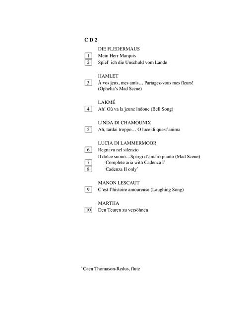 The companion accompaniment recordings to the best-selling series in the G. Schirmer Opera Anthology. Each aria is recorded by a professional coach/accompanist working in the opera world. Contents: ALCINA: Tornami a vagheggiar · ARIADNE AUF NAXOS: Grossmachtige Prinzessin... Noch glaub' ich dem einen ganz mich gehorend · UN BALLO IN MASCHERA: Volta la terrea · IL BARBIERE DI SIVIGLIA: Una voce poco fa · LES CONTES D'HOFFMANN: Les oiseaux dans la charmille (Doll Song) · LES DEUX AVARES: Plus de depit, plus de tristesse · DINORAH: Ombre legere (Shadow Song) · DON PASQUALE: Quel guardo il cavaliere... So anch'io la virtu magica · DIE ENTFUHRUNG AUS DEM SERAIL: Durch Zartlichkeit und Schmeicheln · LA FILLE DU REGIMENT: Chacun le sait · DIE FLEDERMAUS: Mein Herr Marquis, Spiel' ich die Unschuld vom Lande · HAMLET: A vos jeux, mes amis... Partagez-vous mes fleurs! (Ophelia's Mad Scene) · LAKME: Ah! Ou va la jeune indoue (Bell Song) · LINDA DI CHAMOUNIX: Ah, tardai troppo... O luce di quest'anima · LUCIA DI LAMMERMOOR: Regnava nel silenzio, Il dolce suono... Spargi d'amaro pianto (Mad Scene) · MANON LESCAUT: C'est l'histoire amoureuse (Laughing Song) · MARTHA: Den Teuren zu versohnen
