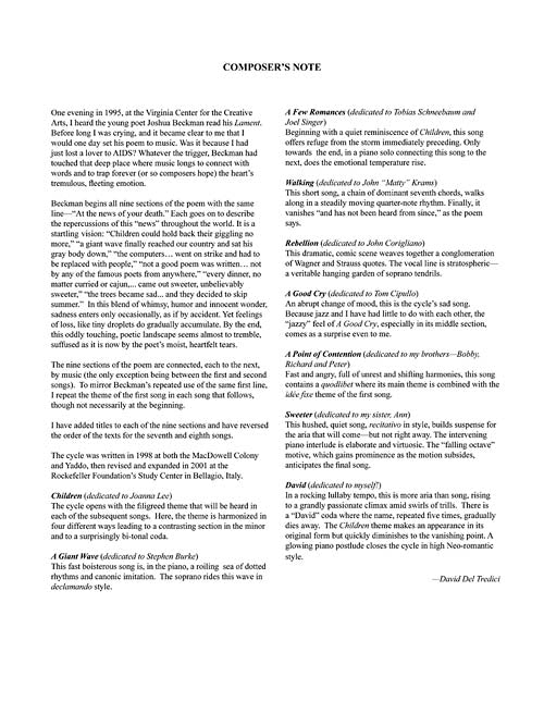 Premiered in 2001, the nine songs of this expressive and moving cycle each begin with the line, At the news of your death.