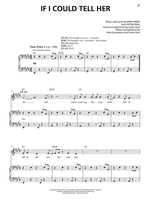 The winner of six Tony Awards®, including Best Original Score and Best Musical, Dear Evan Hansen has struck a remarkable chord with audiences and critics everywhere. With advanced ticket sales in excess of $20 million and its soundtrack debut at #8 on the Top 200 Album Billboard chart, it is on track to be one of the most successful Broadway musicals of all time. The show officially opened on Broadway on December 4, 2016, after a successful Off-Broadway run. The musical features a score by Benj Pasek and Justin Paul who were both personally involved in editing and approving the Hal Leonard Vocal Selections. Pasek and Paul won an Oscar for Best Original Song for being the lyricists behind City of Stars from La La Land. They have also received numerous awards for their previous stage productions A Christmas Story, The Musical; Dogfight; James and the Giant Peach; and Edges. This Music Minus One vocal folio includes professionally-produced sound-alike audio tracks for demo and performance online for 13 songs from the soundtrack, including: Anybody Have a Map? · Disappear · For Forever · Good for You · If I Could Tell Her · Only Us · Requiem · Sincerely, Me · So Big/So Small · To Break in a Glove · Waving Through a Window · Words Fail · You Will Be Found. The book includes piano/piano arrangements featuring piano arrangements by Alex Lacamoire and Justin Paul. Audio is accessed online using the unique code inside the book and can be streamed or downloaded. The audio files include PLAYBACK+, a multi-functional audio player that allows you to slow down audio without changing pitch, set loop points, change keys, and pan left or right.
