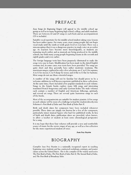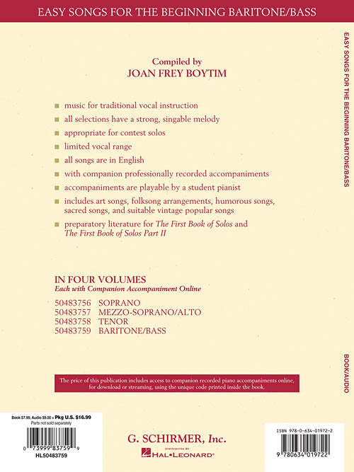 This series was designed to supplement traditional vocal instruction and works perfectly as preparatory literature for The First Book of Solos and The First Book of Solos Part II. Each piece is in English and has a limited vocal range as well as a piano accompaniment that is playable by a student pianist. The pieces include art songs, folksongs, humorous songs, and suitable vintage popular songs and are all appropriate for contest solos. The book includes a code to acess professionally-recorded piano accompaniments online via download or streaming. Baritone/Bass Contents: Aura Lee (Poulton) · Beautiful Dreamer (Foster) · The Erie Canal (Folksong) · Foolish Questions (Folksong) · Funiculi, Funicula (Denza) · Go Down, Moses · I Wish I Was Single Again (Beckel) · If You Were the Only Girl in the World (Ayer) · The Jolly Miller (arr. Manney) · Joshua Fit the Battle of Jericho · The Lark in the Morn (arr. Sharp) · The Lost Chord (Sullivan) · The Minstrel Boy (arr. Weckerlin) · Mrs. Murphy's Chowder (arr. Culli) · Out of My Soul's Great Sadness (Franz) · Request (Franz) · Simple Gifts (Shaker song) · Smick, Smack, Smuck (Sousa) · Sometimes I Feel Like a Motherless Child (arr. Burleigh) · The Story of a Tack (Parks) · Swing Low, Sweet Chariot · Where Did You Get That Hat? (Sullivan) · While Strolling Through the Park One Day · You'll Miss Lots of Fun When You're Married (Sousa).