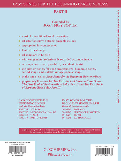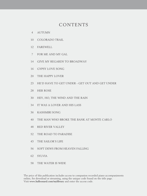 This series now has a new Part II for each voice type, at the same level as the original volumes. This is preparatory material for The First Book of Solos series, with modest ranges and all songs in English, including very easy art songs, folksong arrangements and vintage popular songs. The song selection is completely different for each voice type with 18-20 songs per volume. Piano accompaniments are accessed online using the unique code inside the book and can be streamed or downloaded. The audio files include PLAYBACK+, a multi-functional audio player that allows you to slow down audio without changing pitch, set loop points, change keys, and pan left or right. Contents: Autumn (Alison-Crompton) · For Me and My Gal (Meyer) · Colorado Trail (Dougherty) · Farewell (Franz) · Give My Regards to Broadway (Cohan) · Gypsy Love Song (Herbert) · The Happy Lover (Wilson) · He'd Have to Get Under - Get Out and Get Under (Abrahams) · Her Rose (Coombs) · Hey, Ho, The Wind and the Rain · It Was a Lover and His Lass (Barton) · Kashmiri Song (Woodforde-Finden) · The Man Who Broke the Bank at Monte Carlo (Gilbert) · The Sailor's Life (Wilson) · Red River Valley (Dougherty) · The Road to Paradise (Romberg) · Soft Dews from Heaven Falling (WF Bach) · The Water is Wide (Ruck) · Sylvia (Speaks) Audio is accessed online using the unique code inside the book and can be streamed or downloaded. The audio files include PLAYBACK+, a multi-functional audio player that allows you to slow down audio without changing pitch, set loop points, change keys, and pan left or right.