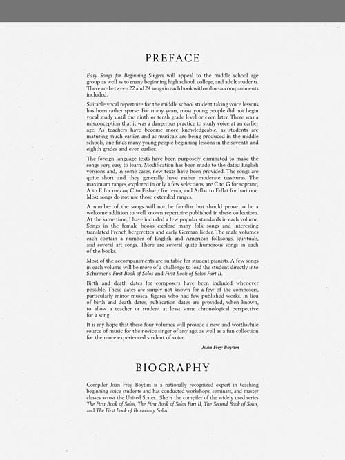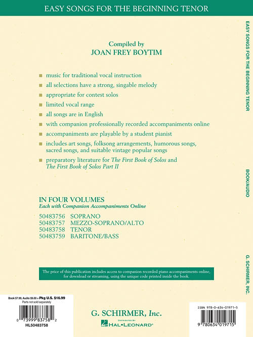 This series was designed to supplement traditional vocal instruction and works perfectly as preparatory literature for The First Book of Solos and The First Book of Solos Part II. Each piece is in English and has a limited vocal range as well as a piano accompaniment that is playable by a student pianist. The pieces include art songs, folksongs, humorous songs, and suitable vintage popular songs and are all appropriate for contest solos. The book includes access to professionally-recorded accompaniments online for streaming or download. Tenor Contents: The Ash Grove (Welch Air) By the Light of the Silvery Moon (Edwards) Come, Aurora (arr. Charles) Drink to Me Only with Thine Eyes (Old English Air) A Fable (Arensky) Flow Gently, Sweet Afton (Spillman) Hark! Hark! the Lark (Schubert) I'm Always Chasing Rainbows (Carroll) If You've Only Got a Moustache (Foster) The Little Irish Girl (Löhr) My Wild Irish Rose (Olcott) Passing By (E. Purcell/Fisher) A Pretty Girl is Like a Melody (Berlin) The Rose of Allandale (Nelson/Goodell) The Rose of Tralee (Glover) Requiem Underwoods (Homer) Santa Lucia (Cottrau) Katy Bell (Foster) Rock-a-My-Soul Scarborough Fair (English Folksong/Sharp) Standin' in the Need of Prayer Steal Away When Irish Eyes Are Smiling (Ball)