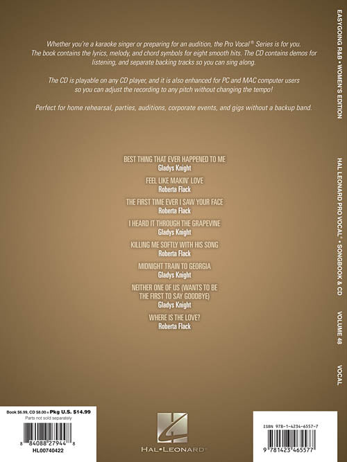Whether you're a karaoke singer or preparing for an audition, the Pro Vocal series is for you. The book contains the lyrics, melody, and chord symbols for nine hit songs. The CD contains demos for listening and separate backing tracks so you can sing along. The CD is playable on any CD, but it is also enhanced for PC and Mac computer users so you can adjust the recording to any pitch without changing the tempo! Perfect for home rehearsal, parties, auditions, corporate events, and gigs without a backup band. This pack includes 8 songs: Best Thing That Ever Happened to Me · Feel like Makin' Love · The First Time Ever I Saw Your Face · I Heard It Through the Grapevine · Killing Me Softly with His Song · Midnight Train to Georgia · Neither One of Us (Wants to Be the First to Say Goodbye) · Where Is the Love?