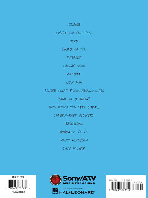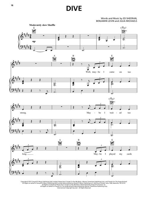 This third studio album release from Ed Sheeran topped the Billboard® 200 album charts upon its March 2017 release, led by the singles Castle on the Hill and Shape of You. Our matching folio includes these two hits, plus 14 others: Barcelona · Dive · Eraser · Galway Girl · Hearts Don't Break Around Here · New Man · Perfect · Save Myself · What Do I Know? · and more.